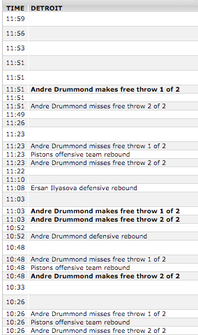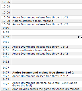 Over the last couple years, a few teams have become quite brazen in their practice of the so-called “Hack-a-Shaq” – fouling horrendous foul shooters like DeAndre Jordan and Andre Drummond away from the ball to force them to shoot free throws. This works as a form of defense. The Rockets, always at the forefront of strategic analytics, took this practice to the extreme this week – fouling Andre Drummond repeatedly at the start of the third quarter. But it worked – Drummond went 5 for 18 from the free throw line in three minutes before the Pistons finally gave in and removed Drummond, a dominant defensive player, from the game. Just look at this god awful play by play: