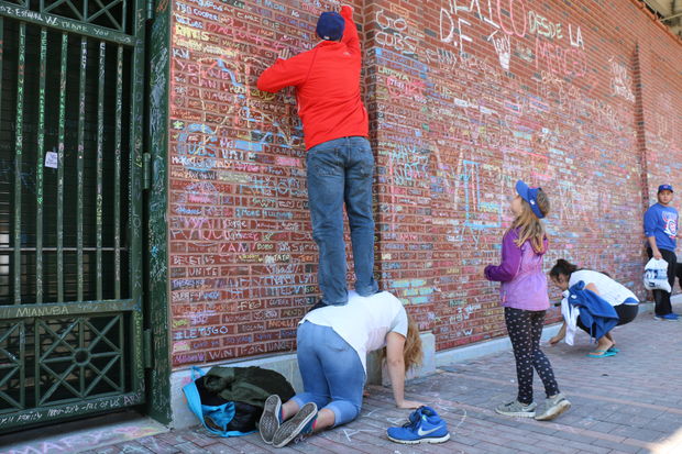 Outside of Wrigley, a makeshift memorial has taken shape. Fans are writing the names of lost loved ones in chalk on a brick wall.