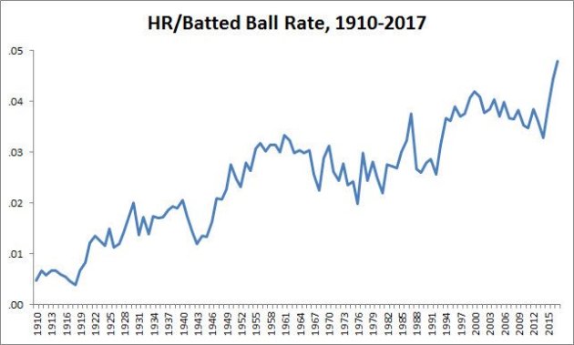 Flyballs are carrying out of the park at unprecedented rates. It’s a fascinating graph. The rates were slowly rising for decades, peaked at the height of the Steroid Era around 2000, began a steady drop and then…boom. All-time highs beginning 2014. Dingers are fun, sure. But what makes a dinger fun is that it doesn’t happen that often. In the playoffs, especially, runs should be at a premium. When home runs are hit as often as they are being hit, it just sorta feels inevitable. It’s like a sugar rush – it’s great in the moment, and then you feel empty. Please, MLB, fix the ball. It’s gotten out of hand. -TOB