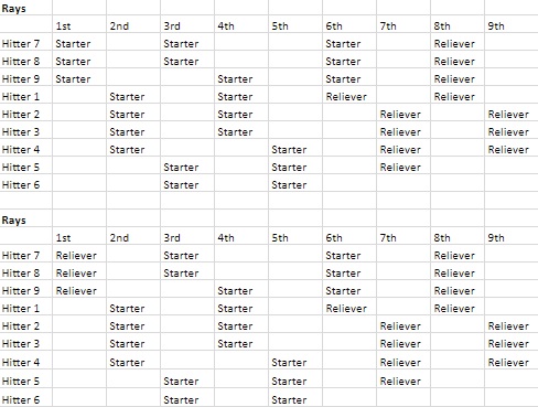 As you can see, for the opposing team, this would add either 1 1/3 or just 1/3 more inning of bullpen work for the Rays, depending on whether the Rays’ start the reliever or the starter in response to the lineup change. This would negate the Rays’ tactic to a large extent. But then it seems it there’d be a race of lineup cards: who commits and turns in their finished lineup card first? Or would the Rays turn in their card, cause you to turn in your card with #7-9 hitting first, and then simply respond by going ahead and starting their “starter” having successfully moved your worst hitters to the top of the lineup? They’d lose that reliever for the day, but it might be worth the sacrifice.