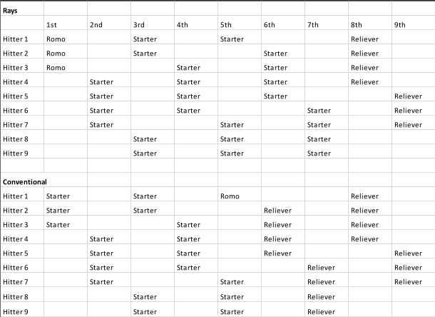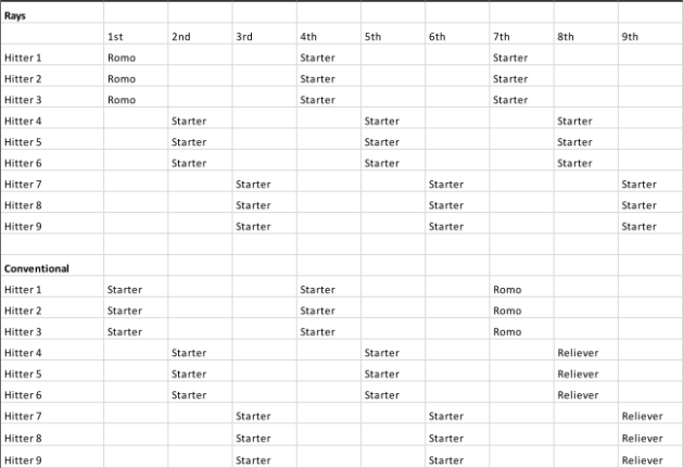 PAL: The risk, as I see it, comes in valuing the number of times a starter faces the best hitters in a lineup over the situation a reliever enters. There’s more data in waiting. In the scenario outlined in the story, Romo enters the game before any situation has played out in the game. Nobody on, nobody out, no score. That’s a very different situation than, say, 2 on and 1 out in the 8th inning with a righty coming up. The “starter” might be done, regardless of how many times he’s faced batters 1-3, and now the Rays have already burned their reliever who is the best bet to get a right-hander out in a critical situation. Admittedly, I’m presenting an argument for one game. The Rays are thinking about getting the most out of and managing a pitching staff over the course of a season.