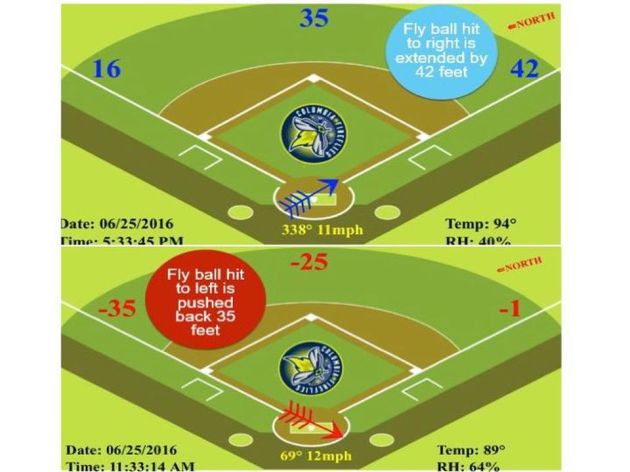 Farley provides this graphic for a specific example of how wind direction on the field affects a ball.