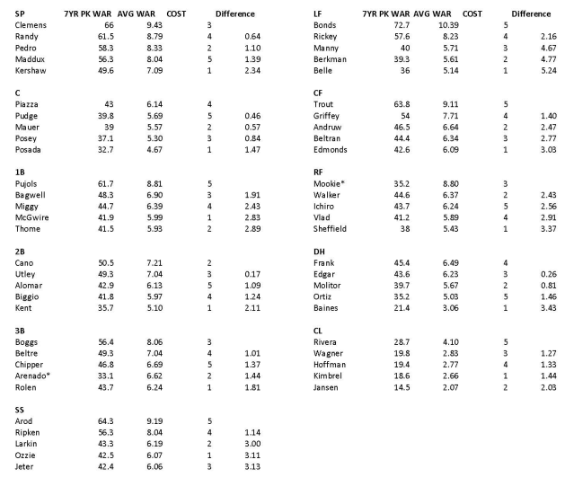 After making my initial list, I wondered what the optimal list would be. From Baseball Reference, I obtained the 7-year peak WAR for each player available. I chose 7-year WAR because, in part, it was pre-totaled for me by Baseball Reference, but also because it seems like a reasonable estimate of a player’s sustained peak – we want the best a player has to offer, while controlling for a single outlier season by taking a larger time span, and controlling for players with lower peaks but more longevity.