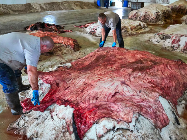 Of course, the first step is turning cows into hide. Farmers refer taking livestock to slaughter simply “moving”. Then the butchers do their job with the beef. Butchers always refer to livestock as the consumer good. Then the meat is separated from the hide, and then the hide is stacked, salted and cured.
