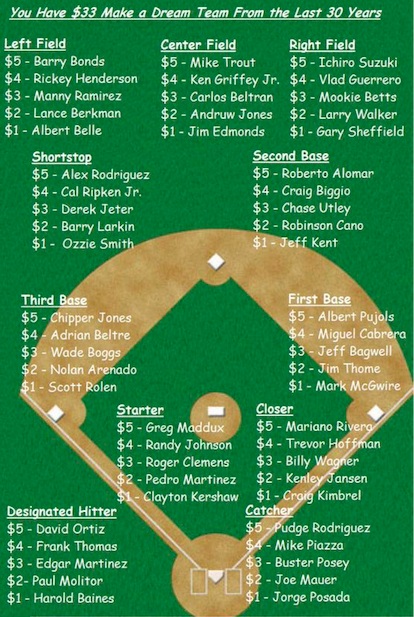 I’m not even sure who created this, but I like it: Using the list above, create the best team you can, with one player from each position, with a salary cap of $33. Before you continue, please make your list.