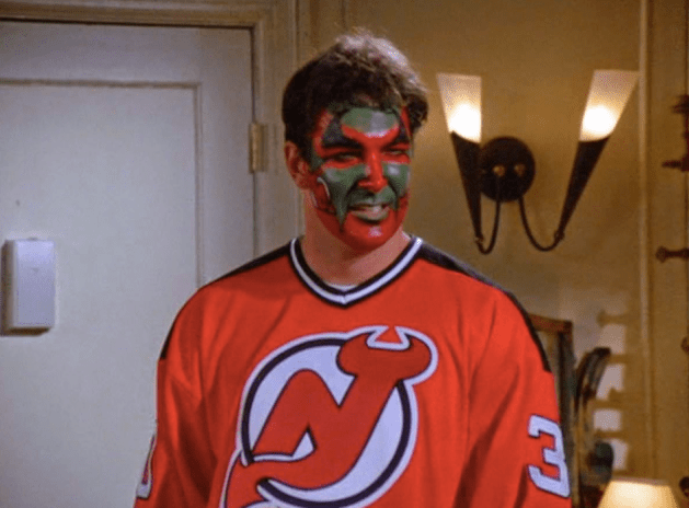 Two happy hockey parents with the missed high five on the occasion of their son’s first NHL…fight.