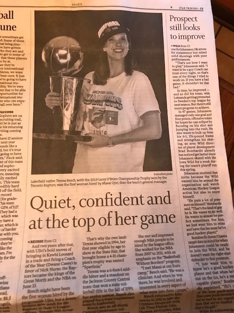 The column is vintage Reusse. It charts Resch’s path to her role as a NBA executive, and how she truly is a pioneer for women in a professional sports league. Teresa’s path started in Lakefield, playing basketball, starring on a state championship volleyball team, and earlier in life winning a champions trophy when she showed Spartinia, the ewe lamb, at the Minnesota State Fair in 1994.