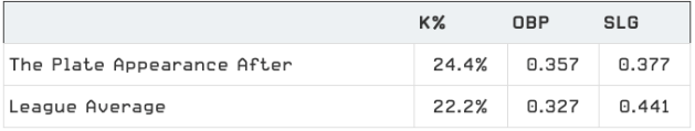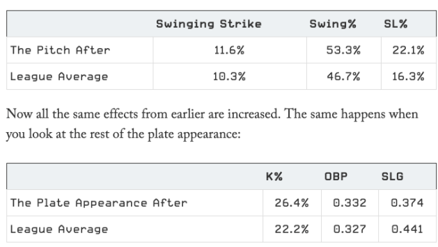 Now you’re seeing that Pirates effect. Slugging percentage goes way down. On-base percentage goes up, of course, since you gave away a ball and got closer to a walk, and it’s even understated by this OBP since a third of these pitches resulted in walks — but it does look like players don’t slug very well once a pitcher throws them a purpose pitch high and tight.
