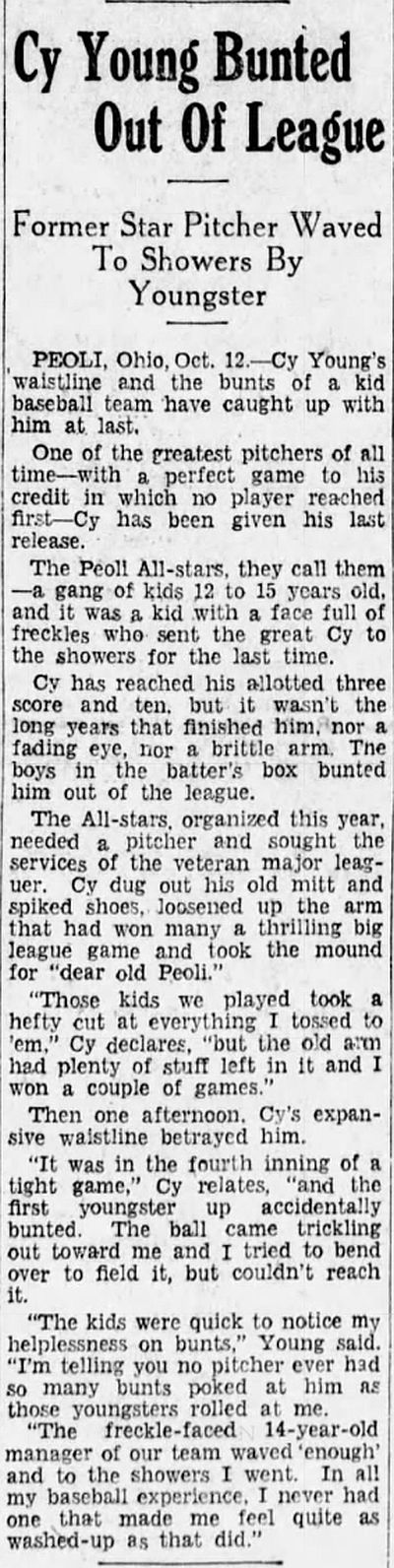 Yes, that is Cy Young, one of the greatest pitchers of all time, attempting a bit of a comeback, at age 67, playing with and against a bunch of teenagers. And that is Cy Young getting run off the mound because they realized the old man could no longer bend over to field a bunt. So those god damn kids bunted right at him, over and over, until Cy Friggin Young had to be yanked from the game. Perfection. *muah* -TOB