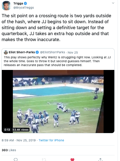 When you watch the video, you might think, hm yeah, good point. Wentz missed the receiver completely and that led to the interception. But remember, we don’t know jack. To prove that point, former Cal Bear and Eagle wide receiver Bryce Treggs weighed in: