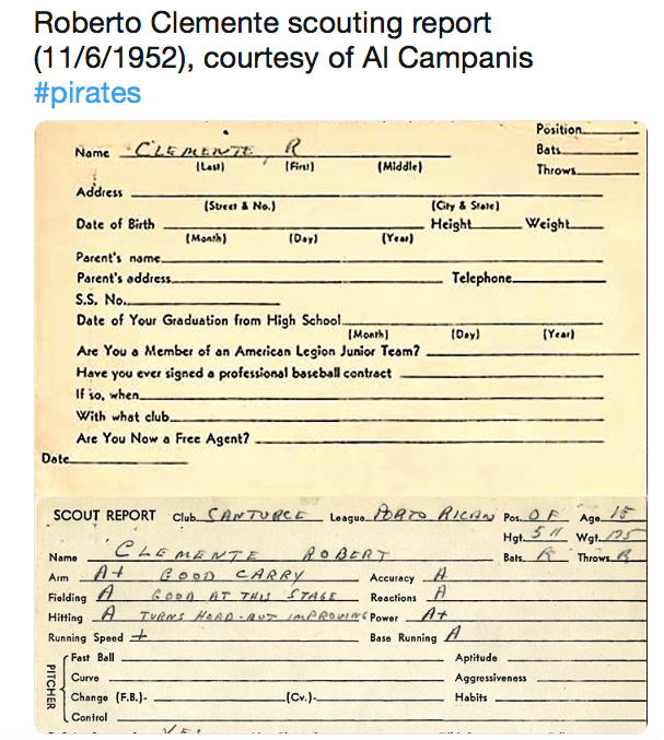 Here’s a pretty cool read for older readers or fans of baseball history. It’s hard to imagine Roberto Clemente in anything other than the honey mustard yellow the Pittsburgh Pirates sported in the 60s. Before he became, as actor David Conrad describes him in short MLB bio video, “the gracenote of Pittsburgh”, Clemente was on track to be a Dodger.