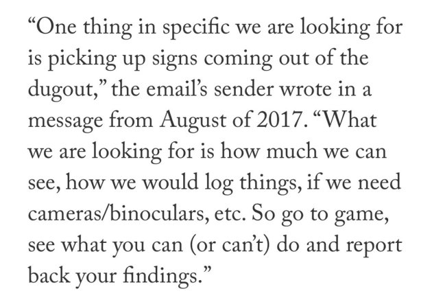 Now, sign stealing in baseball is damn near as old as sign making. Teams have long been accused of trying to steal signs with a runner on second base signaling the pitch selection or location to the hitter. But while that ruffles some feathers, it’s also one of those things that everyone does and no one is sure what benefit it provides, and so it never makes much more than a small ripple.