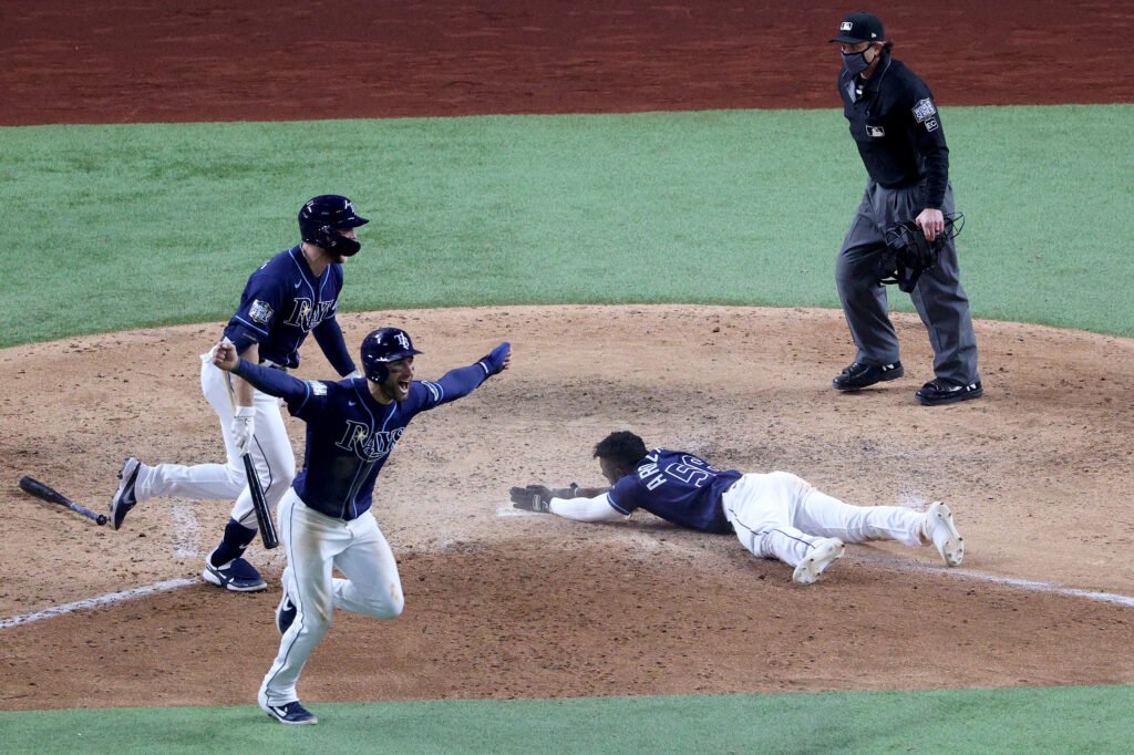 But let’s get back to Smith, who thought he had to hurry, not knowing he had all the time in the world. But he hurried too much, and the ball glanced off his glove, hit the umpire, and rolled away. Arozarena noticed the ball slip by, reversed course back toward home, and made the coolest awkward slide in baseball history, slamming home plate repeatedly for emphasis. Series tied 2-2.