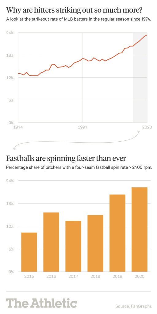 Back on May 7, just one month into the baseball season, we wrote about the insane strikeout rate across MLB. April 2021 saw over 1,000 more strikeouts than hits. For context, before May 2018, there hadn’t been a single month in MLB history with more strikeouts than hits. In fact, before 2020 (a two month season), there had never been an MLB season with 1,000 more strikeouts than hits. Again: this year, we saw that in the month of April alone.