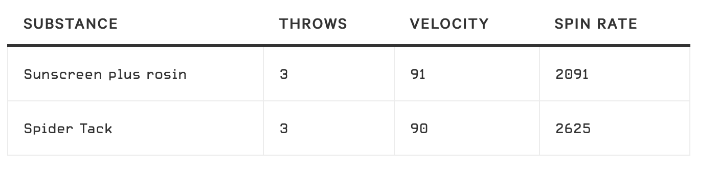 “I’ve tested all sorts of different stuff in the lab up at Driveline,” Bauer told Jordan Bastian in 2018. “I sat down with a chemical engineer to understand it. At 70 mph, when we were doing the tests, spin rates jumped between 300-400 rpm while using various different sticky substances. The effect is slightly less pronounced at higher velocities — more game-like velocities — but still between 200-300 rpm increase. So, that’s a lot of the research we’ve done. We’ve done it with multiple test subjects. … And those are the results we found.”