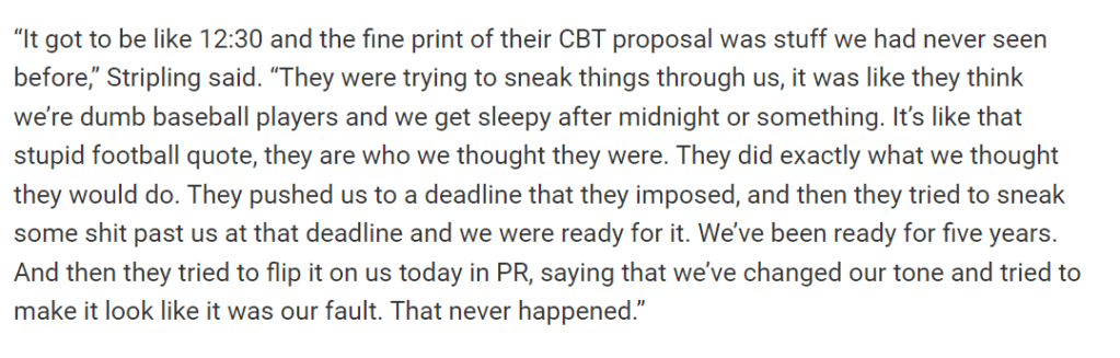 And top of all that, the Blue Jays’ Ross Stripling reports that in the wee hours on the last full day of negotiations before MLB’s self-imposed and artificial deadline expired, the owners tried to shove a bunch of crap down their throats.