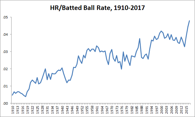 Since the All-Star break in 2015, the home run rate in major league baseball has dramatically, and suddenly, increased. You can see in this chart, it’s the biggest 3-year increase ever, including over the end of the dead-ball era, and the beginning of the Steroid Era.