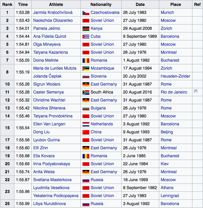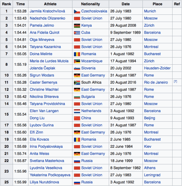Combine her physique with a record that’s never been broken (or even really seriously challenged), and a state-sponsored doping program, and people are going to draw some conclusions. In fact, take a look at the women’s 25 fastest 800 meter times. Anything stand out?