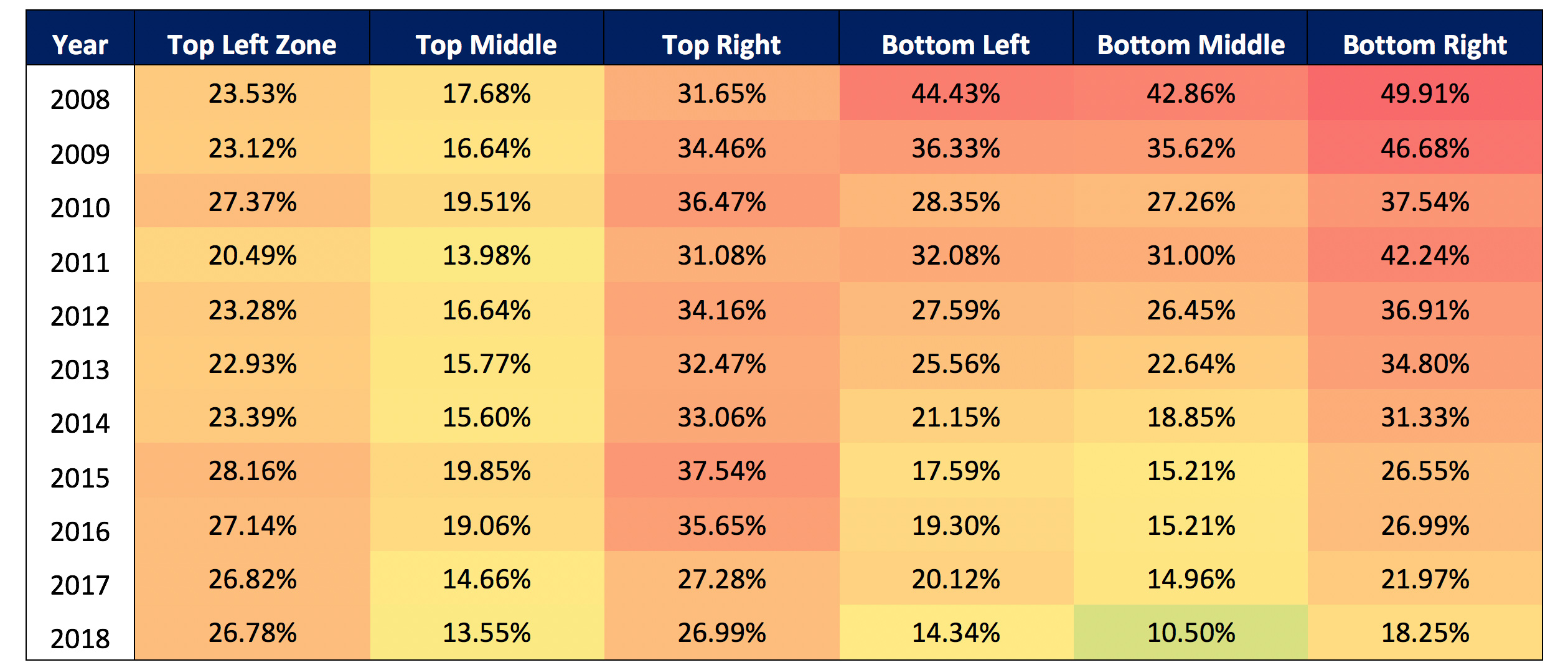 I find it fascinating how umpires have improved at calling low pitches, especially with how putrid they were in 2008 (49% incorrect in the lower right zone!!). My guess is MLB recognized this issue and educated umpires on it. Still, pitches in the upper corners remain absurdly incorrect (27%).