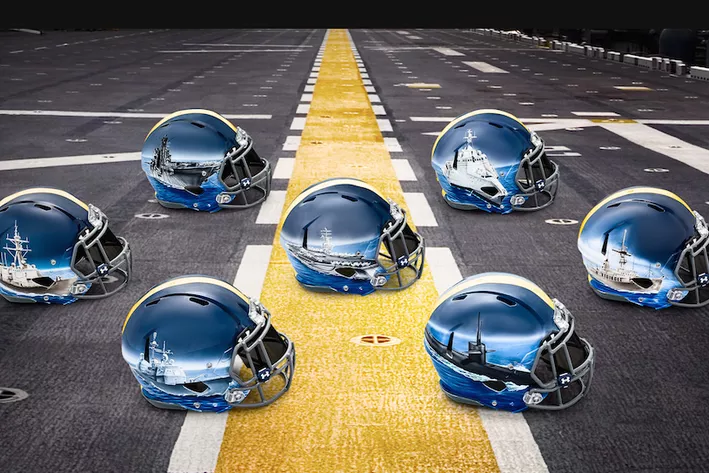 Source: “Navy’s Badass Helmets for Army Game Have Hand-Painted Ships, Custom For Each Position Group”, Jason Kirk, SB Nation (11/30/2015)